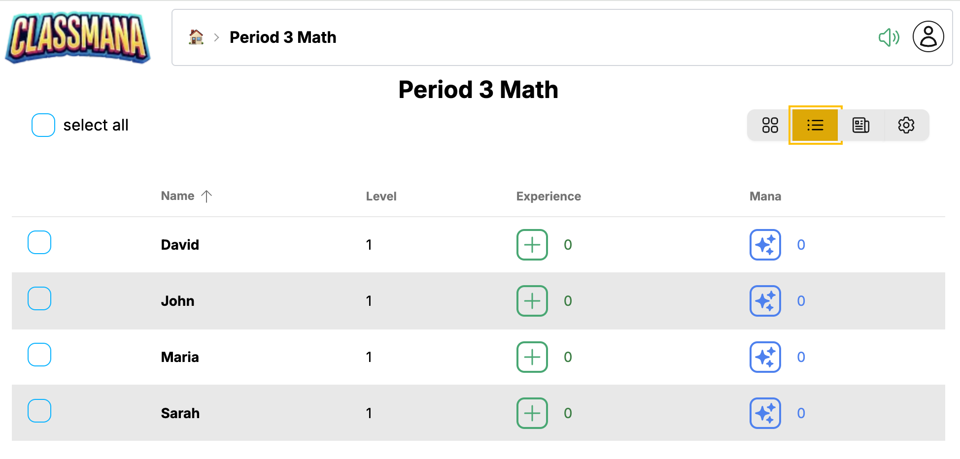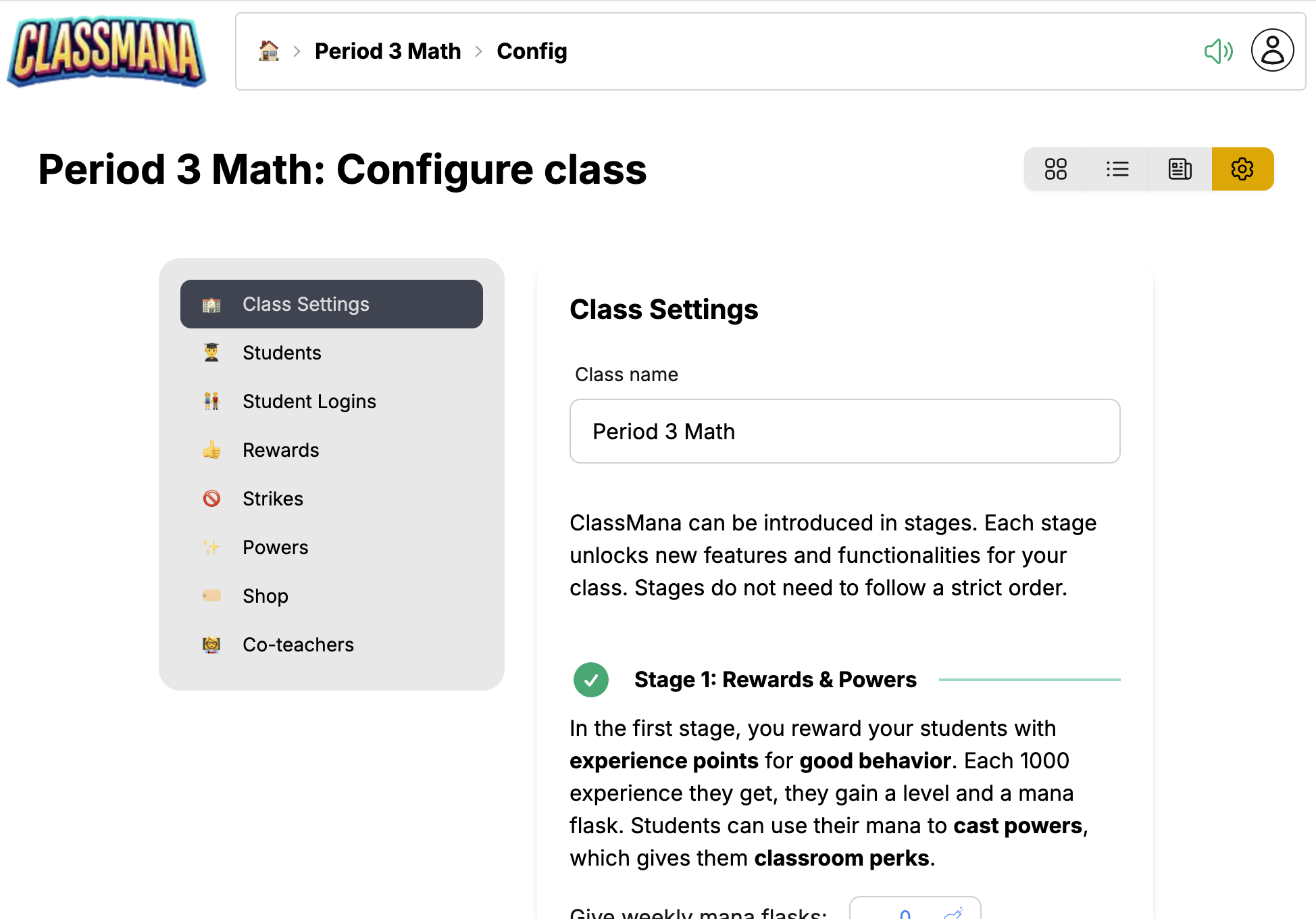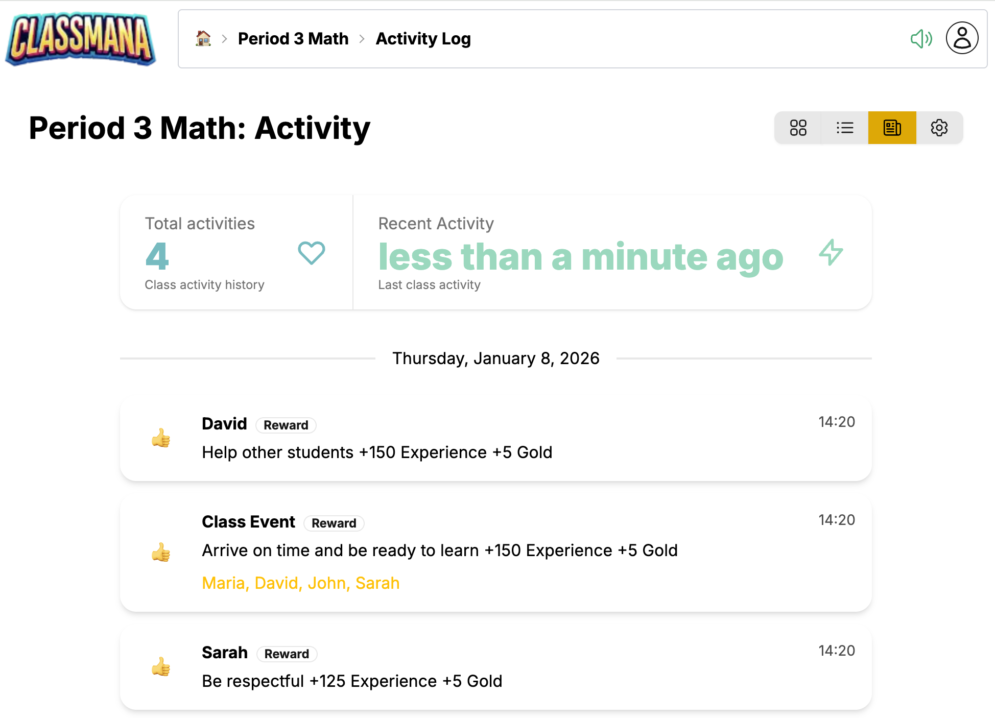 Nadzorna plošča razreda je vaš osrednji center za upravljanje razreda. Od tu lahko gledate učence, dajete nagrade, uporabljate moči, sledite aktivnosti in konfigurirate nastavitve razreda.