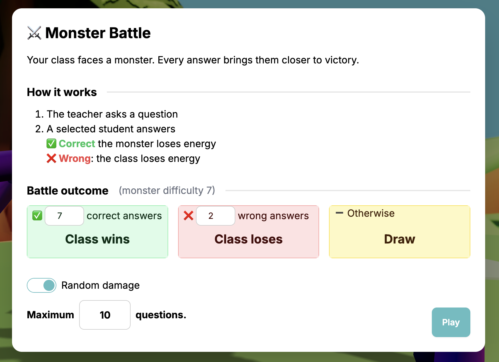 - 🏠 Nadzorna plošča → Učiteljska orodja → Bitka z Pošastmi