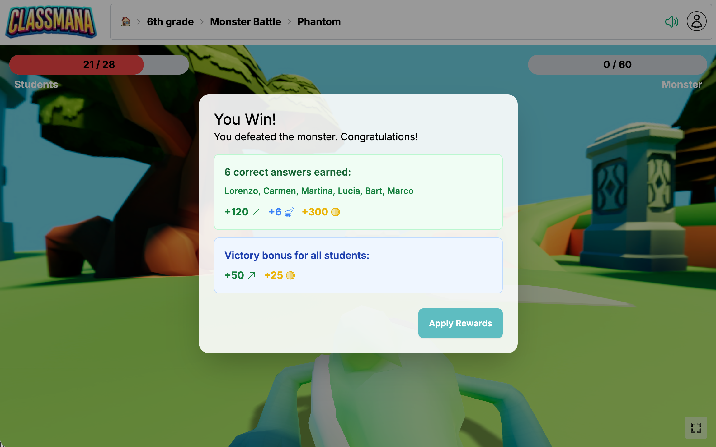 Kliknite Uporabi nagrade za dodajanje vseh nagrad v profile učencev. Vnosi v dnevnik aktivnosti so samodejno ustvarjeni s komentarji kot "Pravilen odgovor v Bitki z Pošastmi" ali "Bonus za zmago v Bitki z Pošastmi".